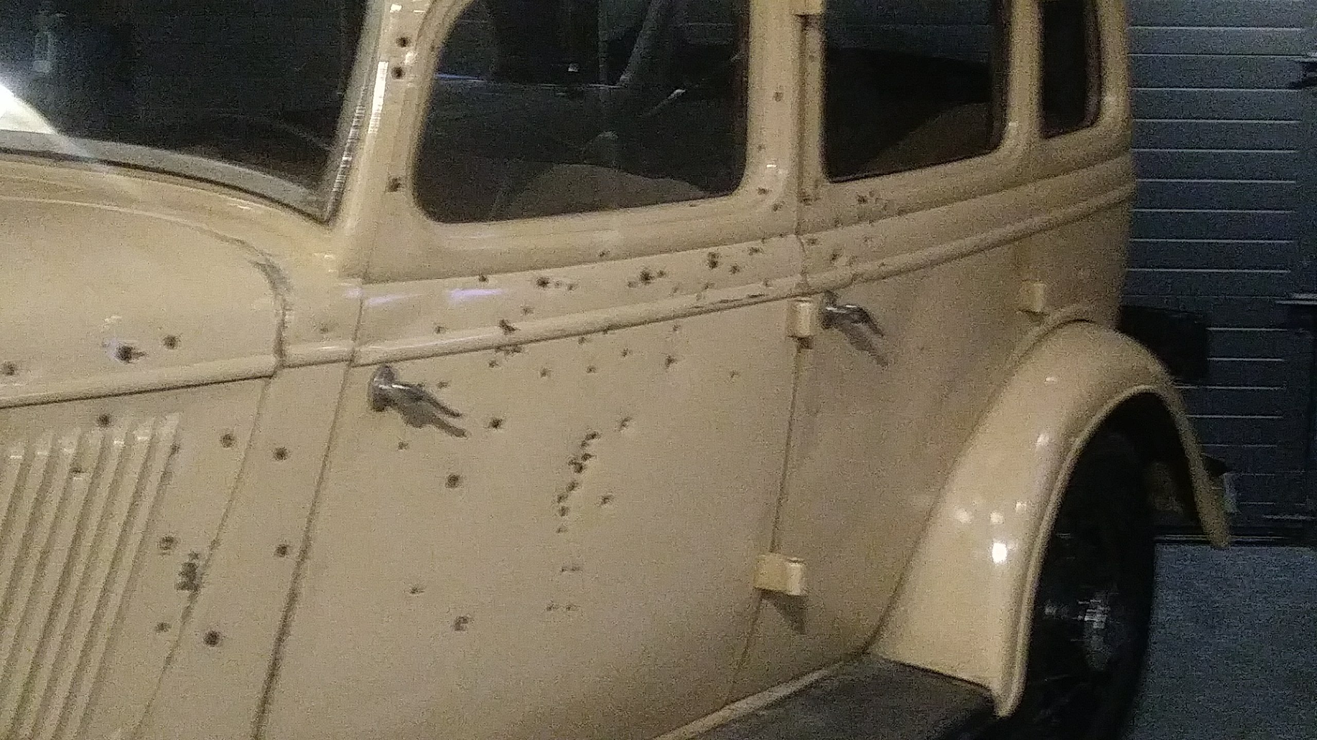 Dodie and I visited the actual ambush site of Bonnie and Clyde last week so it was interesting to see their items here. The car, nestled between gangster Bugsy Siegel’s automobile and the OJ Simpson Bronco, is actually the one used in the Warren Beatty and Faye Dunaway movie, “Bonnie and Clyde” from 1967.