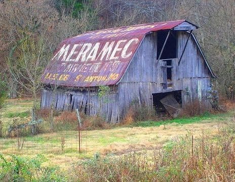 Popping up like old Burma Shave or The Thing signs in Arizona, Mermac Caverns advertising is painted on barns and scattered on billboards along IH-44. Located near Stanton, Missouri, they bill it as “The Jesse James Hideout,” a disputed claim. There’s even a Jesse James Museum across the highway claiming he lived until 1951.