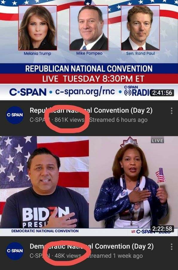 Update (August 26, 2020 7 p.m. CST): Day 2 results for C-Span is even better than the first day of the convention for President Trump. The GOP’s second day was 861,000 compared to the Democrats 48,000.