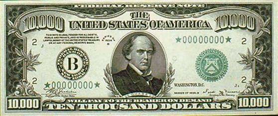 On the ten-thousand-dollar bill, nineteenth-century U.S. Supreme Court Chief Justice Salmon Chase.