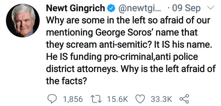 “The No. 1 problem in almost all the cities is George Soros-elected, left-wing, anti-police, pro-criminal district attorneys who refuse to keep people locked up,” Gingrich said on Fox News’s Outnumbered. “Both Harris and Biden have talked very proudly about what they call progressive district attorneys. Progressive district attorneys are anti-police, pro-criminal, and overwhelmingly elected with George Soros’s money. And they are a major cause of the violence we are seeing because they keep putting the violent criminals back on the street.”