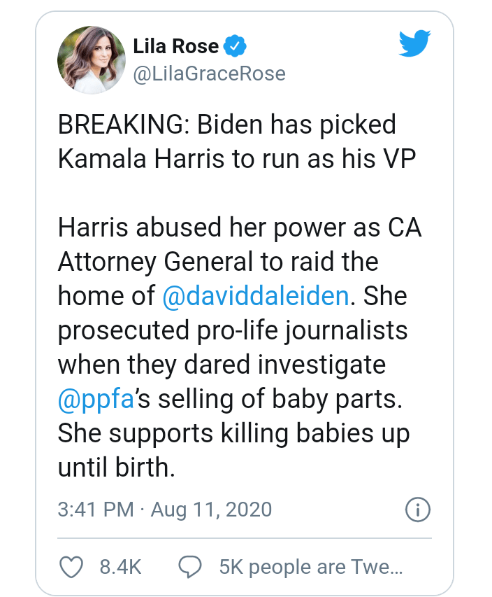 Honing in on Harris’ actions, according to TMS, a “judge dismissed seven of the fifteen felony criminal charges against pro-life citizen journalist David Daleiden stemming from his undercover investigation of Planned Parenthood, leaving him facing eight felony counts.”