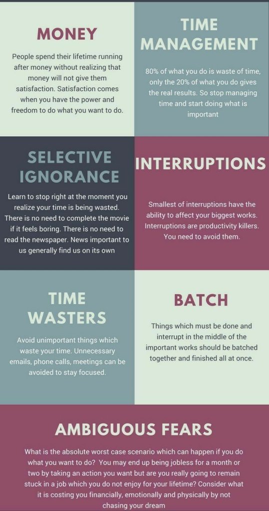 Only consume information for something immediate and important. Information is useless if it is not applied to something important or if you will forget it before you have a chance to apply it. Focus on “just in time” information instead of “just-in-case” information.