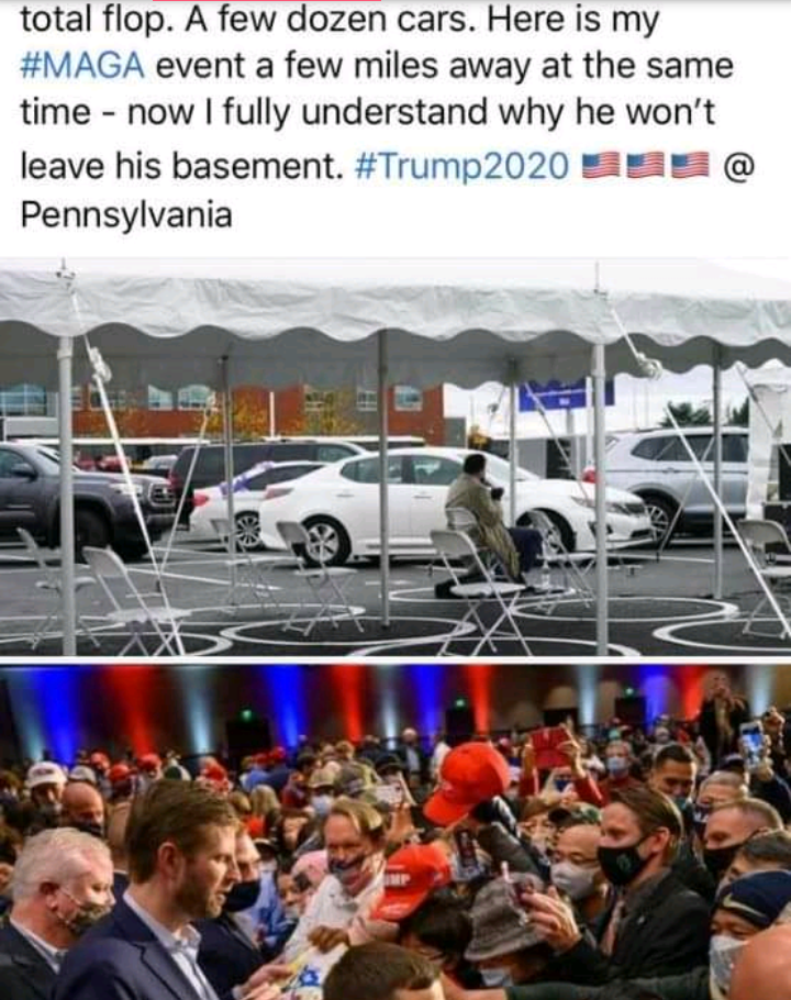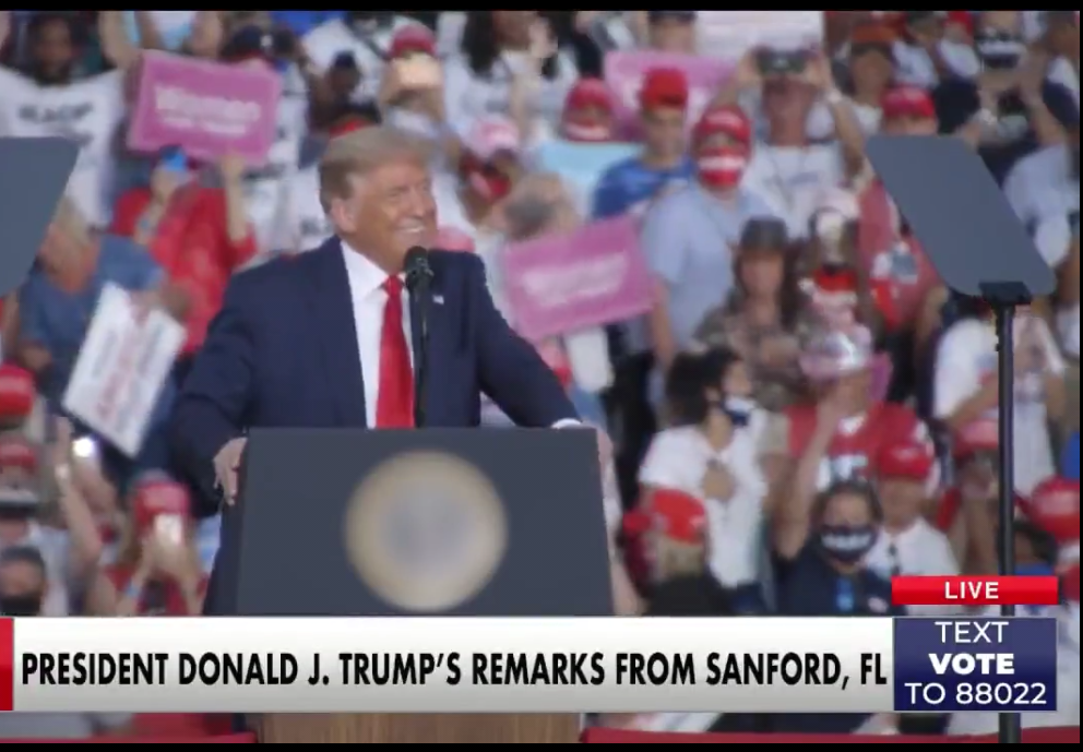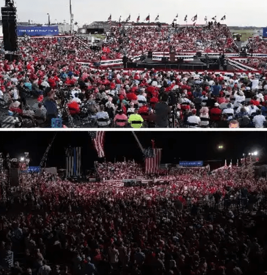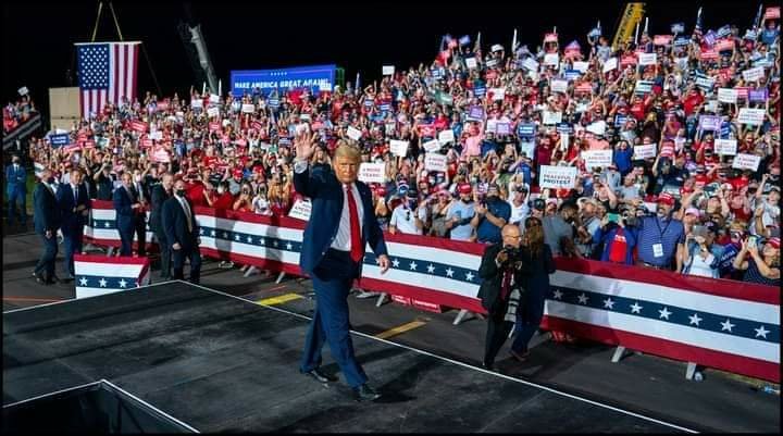 From September 1 to October 25, 2020, President Trump’s appearances were attended by 469,783 people. This included crowds sizes near 35,000 each in Fayetteville, NC, Newport News, VA and Jacksonville, FL.