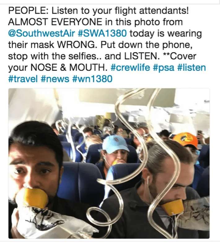 “If needed, four oxygen masks will drop from the compartment overhead. To activate the flow of oxygen, pull down on the mask until the plastic tubing is fully extended. Place the mask over your nose and mouth and breathe normally.