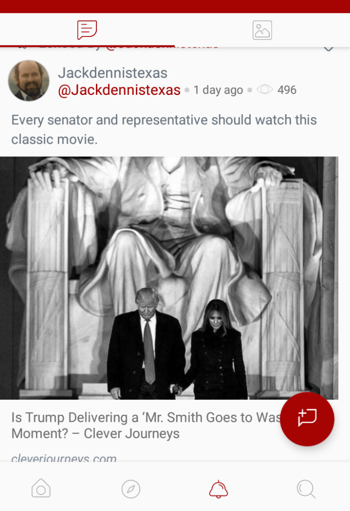 In this example, with President and First Lady Trump at the Lincoln Memorial, notice the “496” on the top right. That means 496 Parler followers read it. Notice the white quote symbol with a “+” sign on it, inside a larger red bubble.