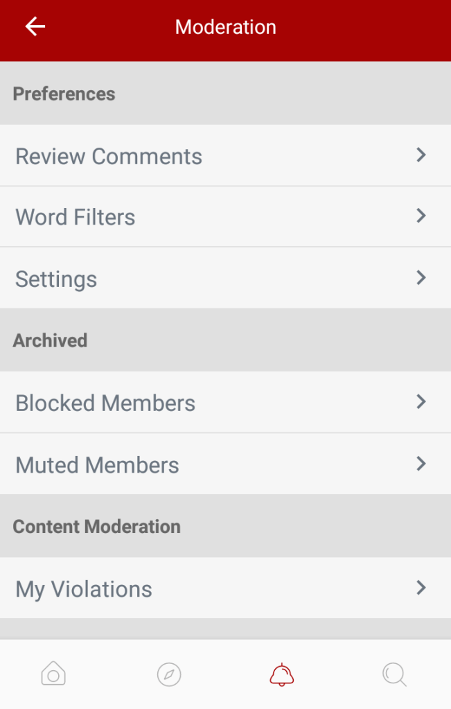 Select the Parler logo in the top left corner or swipe right to open the navigation menu. Select Moderation > Review Comments. You will now see a list of comments made to your content. You can approve, deny, mute, or mark as spam.