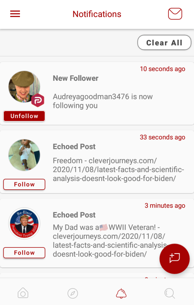 If you click the second to the left icon, it will take you to the Discover page. This allows you to search for news, posts from partners of Parler, and influencers. Interacting with posts and people discovered on this page can boost your presence on Parler. The Discovery Page can be accessed by selecting the Discover Page icon in the top right corner.