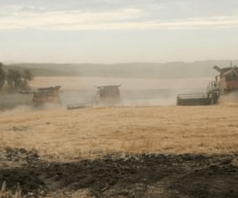 Neighbors, friends, and family from the Crosby community brought 11 combines, 6 grain carts, and 15 semis. Within 7 hours they were able to get Unhjem’s durum wheat and canola corn in the bin.