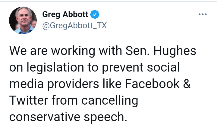 “We are working with Sen. [Bryan] Hughes on legislation to prevent social media providers like Facebook & Twitter from cancelling conservative speech,” Abbott said.
