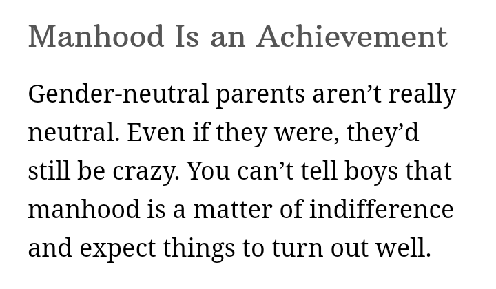 When they become adults, it will have repercussions in their personal lives as well. Most women are hardwired by nature to desire a masculine man, NOT one who’s feminized. I think this not only serves to strip man of their strength and rightful place as head of the family, but also to decrease the birthrate and thus, the population. Because no woman worth her salt wants to procreate with a feminized man. It’s just reality and common sense.