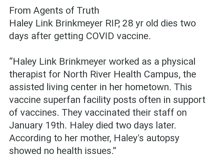 Yesterday a smart man who worked for me at HEB for many years said after reading more about the dangers (including my articles) he and his wife cancelled their vaccine appointments. I was overjoyed. That makes 12 people who told me they are not taking it after reading the articles and some have known friends and family who died after taking them. No not all were elderly.