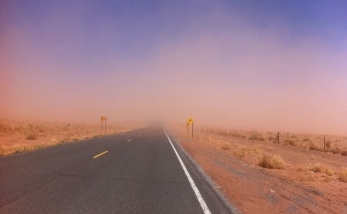 Highway warning signs advised of hard winds and dark dust storms ahead. The five mile drive from the highway to the Crater Visitor Center was surreal as if we were on Mars. I could barely stay on the two lane road with red dirt and heavy gusts fighting me all the way.