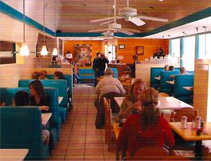 The server sat me at a small table facing an empty booth next to the front picture windows. Within seconds she sat a man down on the right booth bench directly in my view.