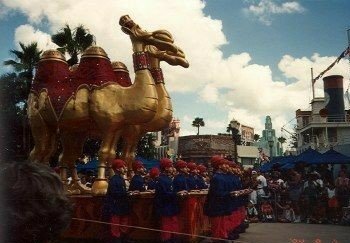 The camels that had appeared in Aladdin’s Royal Caravan parade stood out front before they were later relocated to the Magic Carpets of Aladdin attraction at the Magic Kingdom.