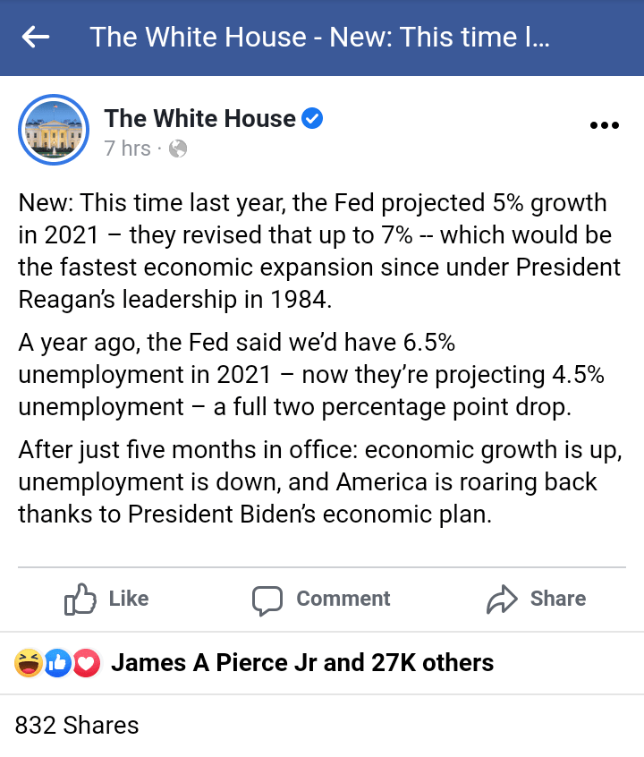 “After just five months in office: economic growth is up, unemployment is down, and America is roaring back thanks to President Biden’s economic plan,” the post roared, but then it fizzled out.