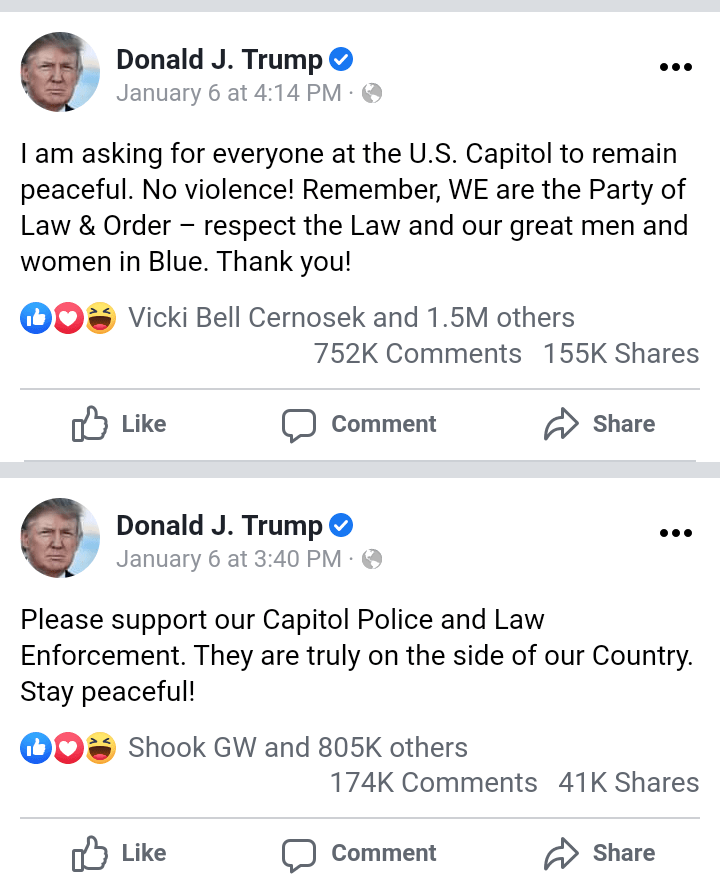 Before President Donald J. Trump was idiotically censored in January, his posts were receiving legendary status–and Facebook still placed those stupid propaganda tags below them. The last three allowed to be posted had 276,000, 756,000 and 174,000 comments. Over 1.5 million responded to request for everyone to remain peaceful at the US Capitol.