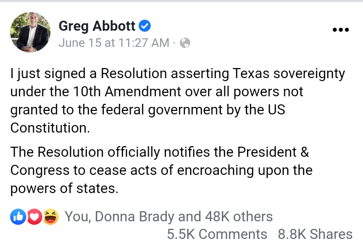 Texas Governor Greg Abbott received over double that amount with his popular post about the 10th Amendment on June 15.