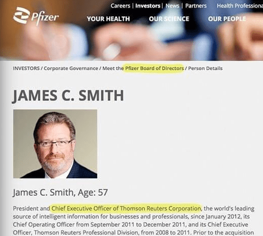 The Reuters news organization consistently gives glowing praise to Pfizer and is always quick with a “Fact Check” for support. But the fact that Reuters’ CEO is on the board of Pfizer has nothing to do with that. It’s probably just a coincidence.