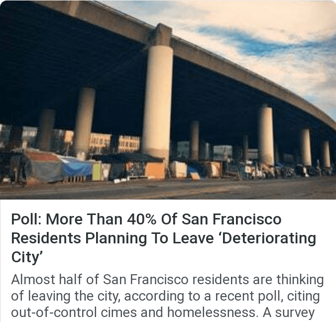 Almost half of San Francisco residents want out of their self induced political and physical cesspool. Have you noticed this happens uniformly in Democrat controlled cities?
