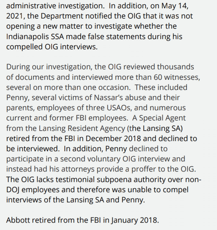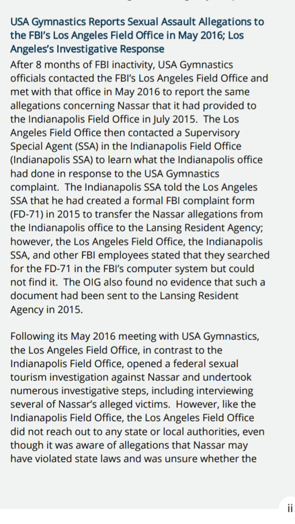 The FBI’s Indianapolis Field Office “made fundamental errors when it did respond to the allegations, failed to notify the appropriate FBI field office… or state or local authorities of the allegations, and failed to take other steps to mitigate the ongoing threat posed by Nassar.”