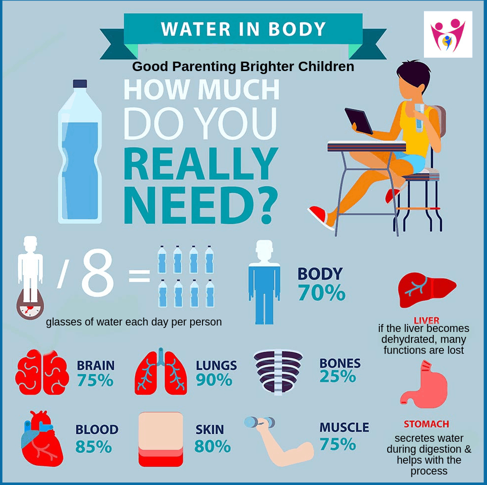 “Water helps in the regulation of the body temperature and also in maintaining the volume of blood in the body,” she notes. “The electrolyte balance is also maintained in the body with help of water. It helps to clear the bowels and aids in digestion.”