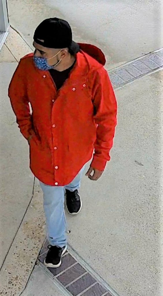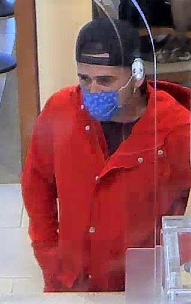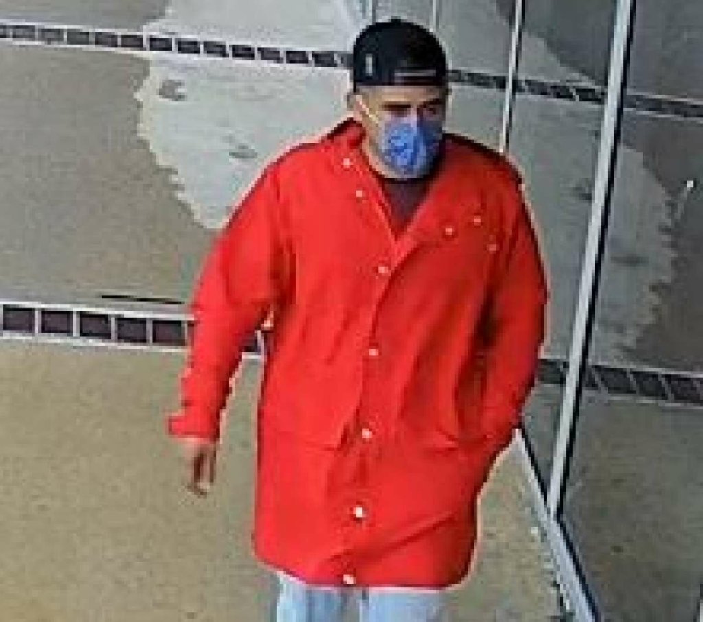 In addition to the red raincoat-style jacket, the thief wore a black baseball cap, blue COVID-style face mask, black shirt, light jeans, and dark shoes.