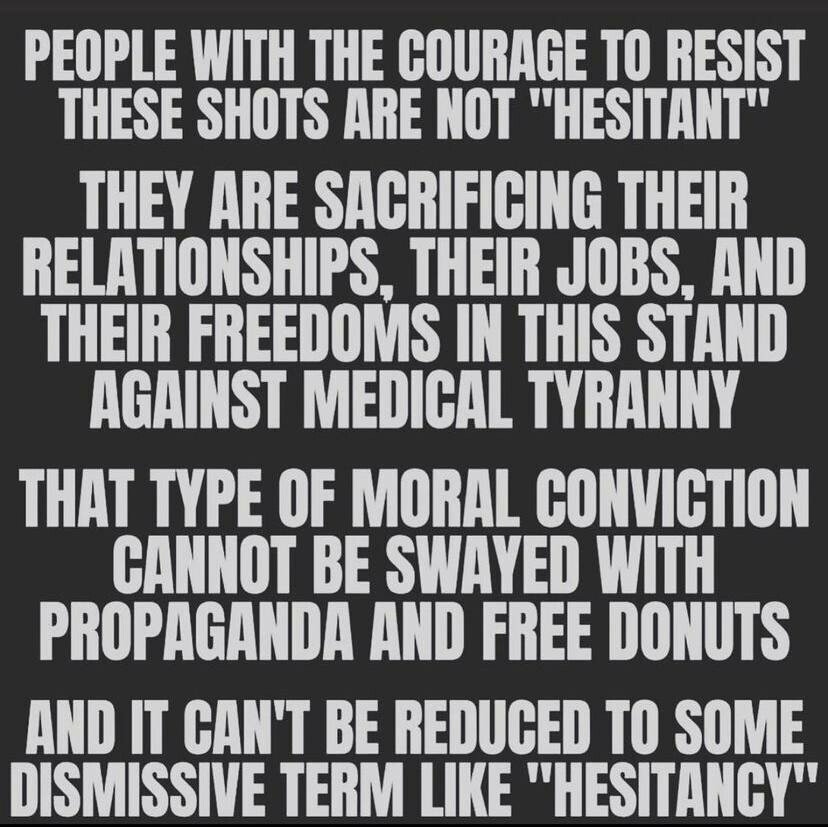 “Hell, we know they’re not vaccines. They are experiments that are killing people, making them sick, injuring them and we are not going to be one of their lab rats.”