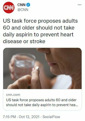 Counter to the NY Times and CNN reactions, low-dose aspirin has been an established and proven common treatment for anyone suffering from blood clotting issues or in danger of stroke. This includes most people who had a heart attack or a myocardial infarction.