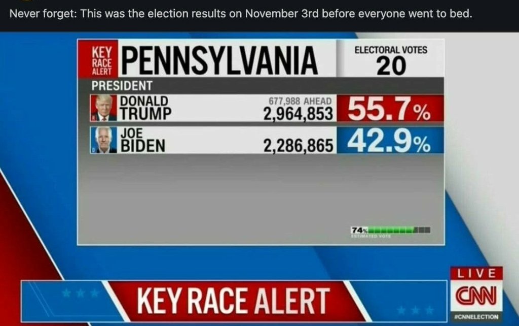 In their previous election, Pennsylvania, in 2018, had 230,000 absentee ballots cast, with 3.5% rejected for signature mismatches or other reasons. In 2020, when more than 1.2 million absentee ballots were cast, the rejection rate fell to 0.3%. Media eliminated this in their reporting and instead used their dishonest mantras, “with no evidence,” “the big lie,” “being untruthful” in regards to President Trump’s and others legitimate information.