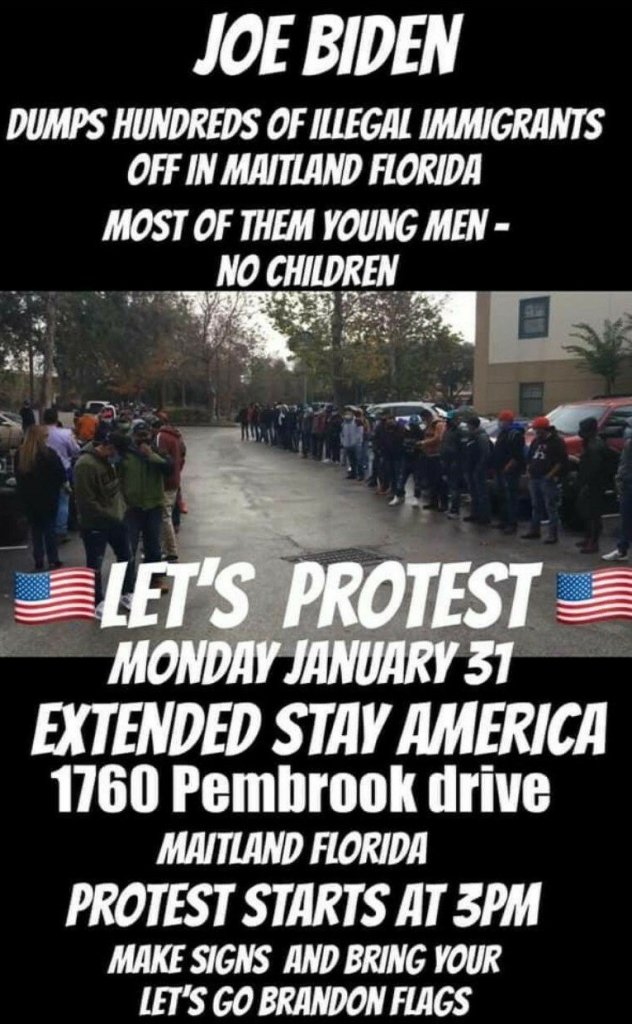 American Patriots in the Orlando, Florida area are calling to action a protest at 3 pm on Monday, January 31, 2022 against Joe Biden’s unlawful relocation of illegal aliens into their communities.
