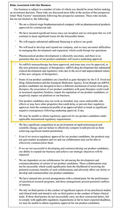 “No mRNA immunotherapy has been approved, and none may never be approved, in this new potential category of therapeutics,” Pfizer warned at the outset. “mRNA drug development has substantial clinical development and regulatory risks due to the novel and unprecedented nature of this new category of therapeutics.”