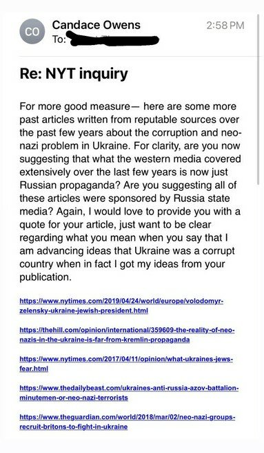 Owens was informed by the New York Times that the outlet was writing an article on her pushing the idea that Ukraine is a “corrupt country” and wanted to bless her with an opportunity to respond.