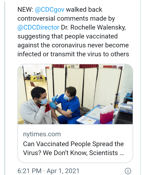 The following day, April 1, 2021, with pressure from Big Pharma and the White House, the CDC had to walk back their director’s comments.