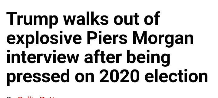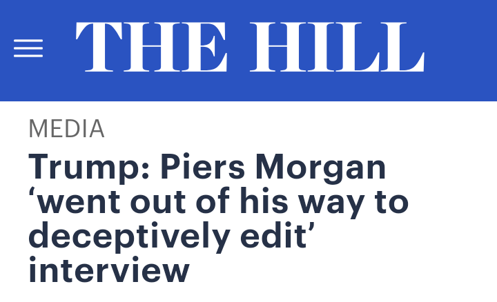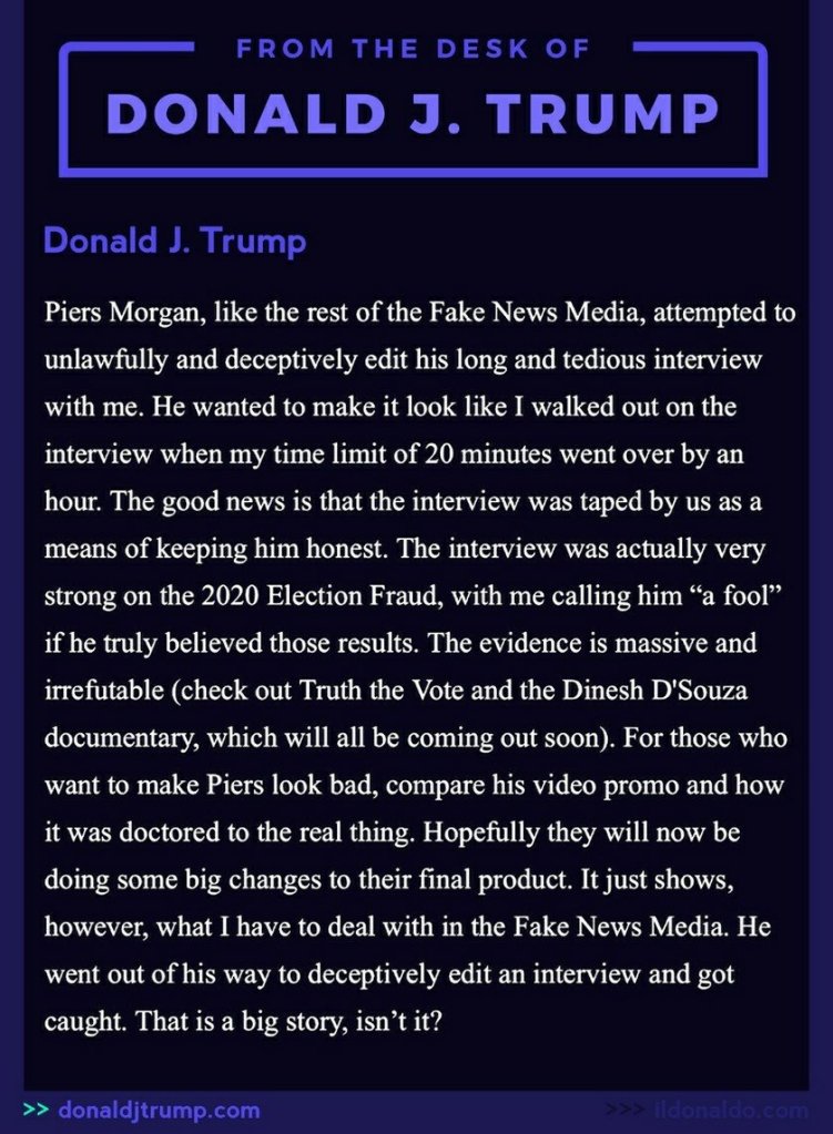 Piers Morgan, like the rest of the Fake News Media, attempted to unlawfully and deceptively edit his long and tedious interview with me. He wanted to make it look like I walked out on the interview when my time limit of 20 minutes went over by an hour.