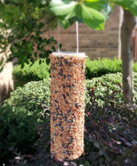- Bird feeder. Use a darning needle to poke and thread a string through the top of the Pringles can. Tie the ends of the string together. Then use a spatula or butter knife to smear peanut butter all over the exterior of the Pringles can. Then roll the prepared can in birdseed. Hang the bird feeder from a nearby tree or garden flag holder.