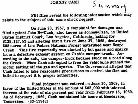 According to Cash’s FBI file acquired via the Freedom of Information Act, the music icon said his camper shot sparks out of its faulty exhaust system after getting stuck along the side of the road. Cash tried to gun the engine and accidentally lit the forest ablaze.