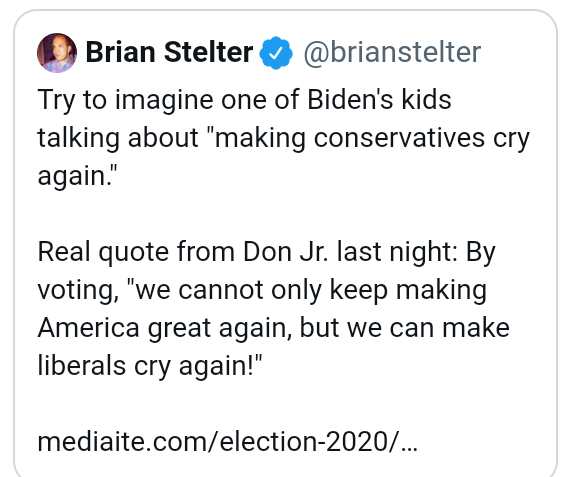 “Try to imagine one of Biden’s kids talking about “making conservatives cry again,” Stelter tweeted. “Real quote from Don Jr. last night: By voting, “we cannot only keep making America great again, but we can make liberals cry again!””