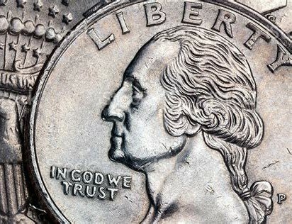 Historically, United States quarters show the head of George Washington facing towards IN GOD WE TRUST.