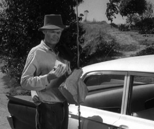 🔹Buddy Ebsen (the original Tin Man in “The Wizard of Oz” 1939 movie, before he became ill from the silver body paint), played the guest star role as hobo David Browne. He is dressed just a shade better here than he is when “The Beverly Hillbillies” television program starts its run the following year.