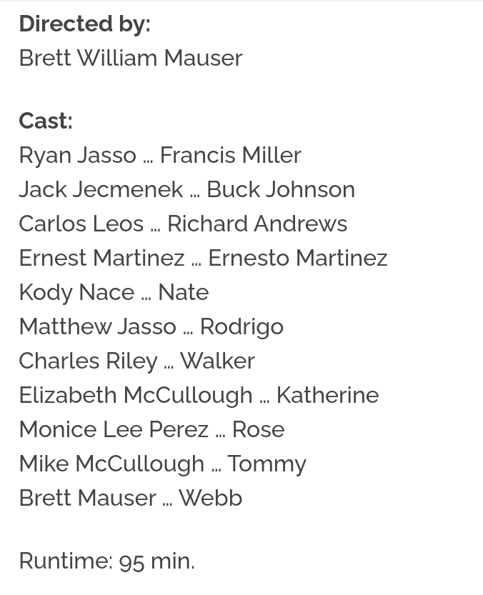 The best acting into this 95 minute movie was by Ryan Jasso (Francis Miller) and Jake Jecmenek (Buck Johnson) who played the prime characters.