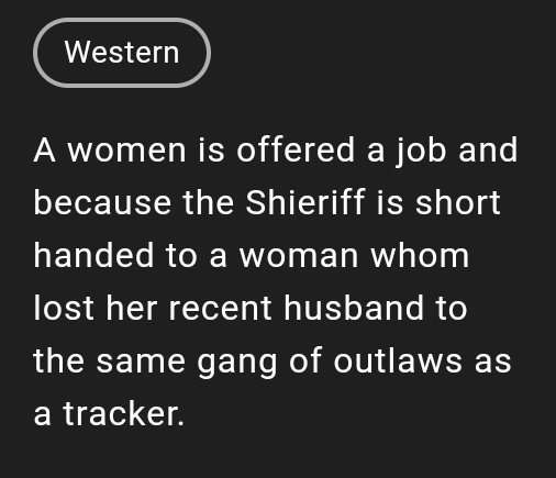 “A women (yes, plural instead of ‘woman’) is offered a job and because the Shieriff (yes, misspelled, rather than ‘Sheriff’) is short handed to a woman (yes, ‘short handed to a woman‘) whom lost her recent husband (instead of an older spouse?) to the same gang of outlaws as the tracker (so the tracker was in a gang of outlaws?).