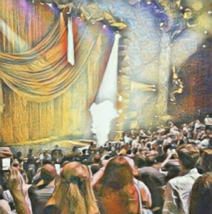 Music and sound effects stirred a puzzled and startling response of gasps in the audience. Spotlights suddenly appeared, shining on a point right above our heads.