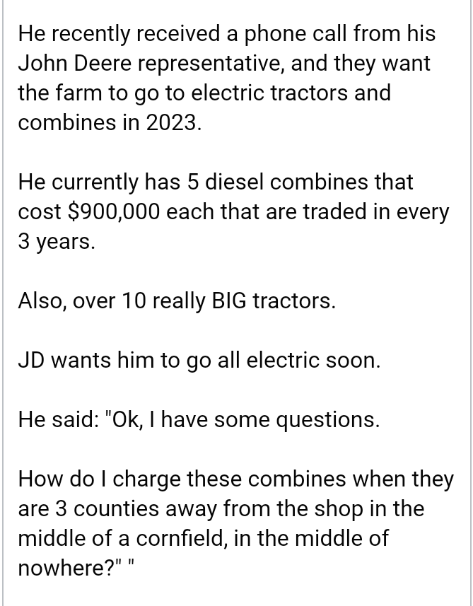 1. Yes, many of the proposals being forced upon the American public and especially workers are from those that most likely never worked in the fields they are determined to regulate. De-fund the police? Guaranteed, not one proponent of that idea ever, ever put on a uniform. Switching to all electric vehicles, especially farm equipment. Those pushing for that very likely never got closer to a field than the produce aisles of Whole Foods or Wegman’s.