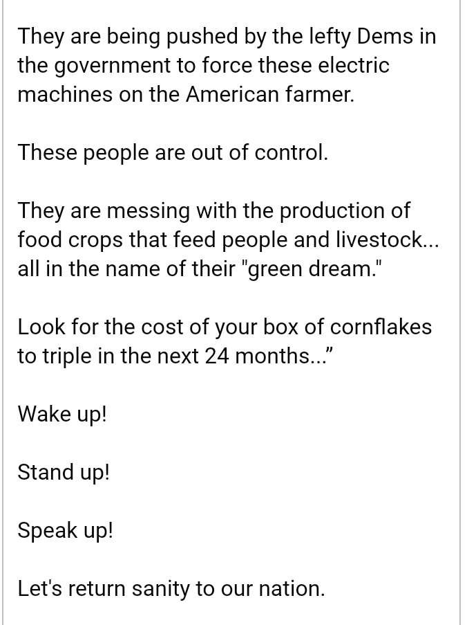 Electric vehicles, including tractors, are part of a future planned by New World Order-World Economic Forum worshipers.