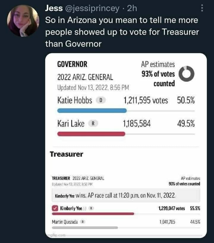 2. The vote counters forgot one race to fix and as a resukt the scam is fully illuminated. The Republican running for state treasurer received ( If I recall correctly) 250,000 votes more than Kari Lake …. oops they are in trouble