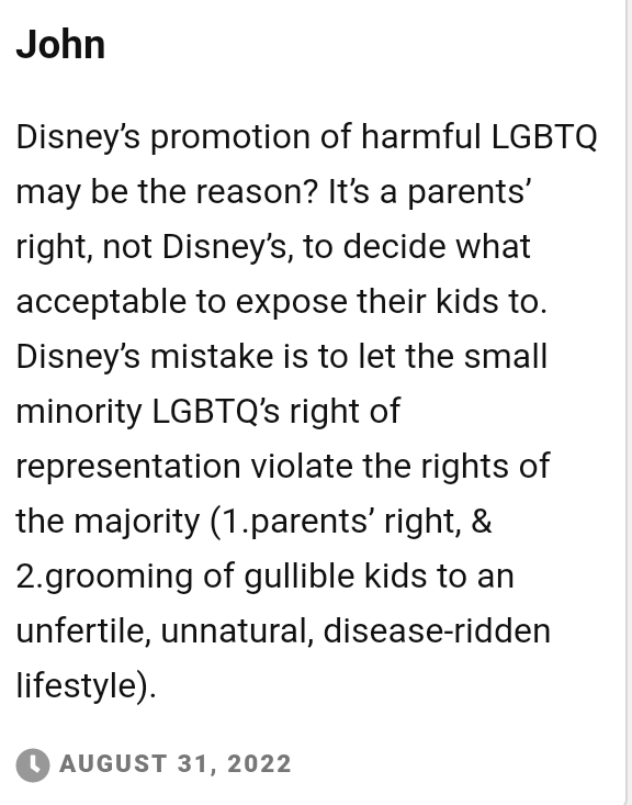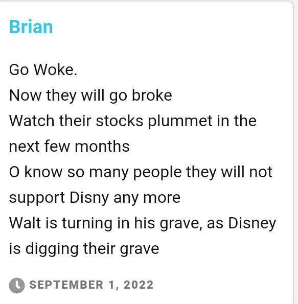 1. Disney is definitely making a bad name for itself. Customers are shouting from the rooftops that they don’t want this woke nonsense. It makes good business sense to listen to the majority of your customers but those morons don’t! RIP Disney!