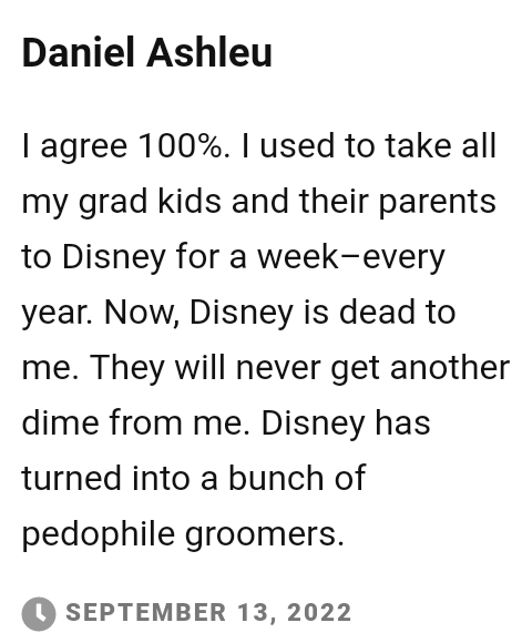 “Although some of the Board of Directors members fortunately left, their replacements are not better,” he revealed. “But hey, they’re not asking us. We are just Disney fans who want our real Disney back and not this creepy nonsense against American family values.”