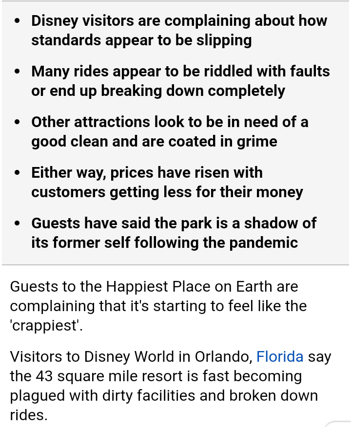 “Service is down. Facilities are going downhill. Many rides are breaking down. Prices are sky high. Hotel rooms are as grim as some of the parks,” his wife, Judith said. “We’ve been coming annually for years and have never seen it anywhere near this bad. Their solution is to cut costs and hire more leftists with marginal credibility. It starts at the top. It feels dirty and slimey, both in the facilities and in their entertainment changes.”