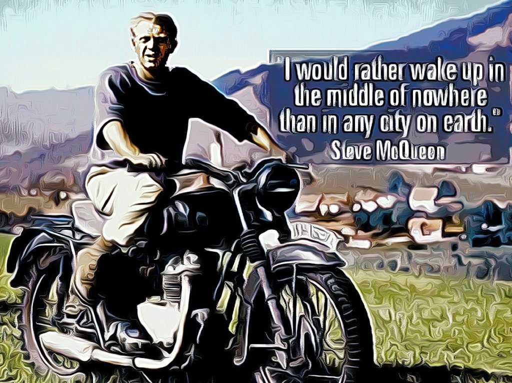 “Racing is life. Anything before or after is just waiting.” And the one with McQueen’s picture with his motorcycle in The Great Escape. hanging up next to Dad’s tool room door: “I would rather wake up in the middle of nowhere than in any city on earth.”